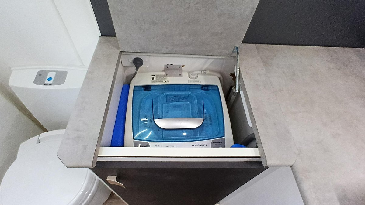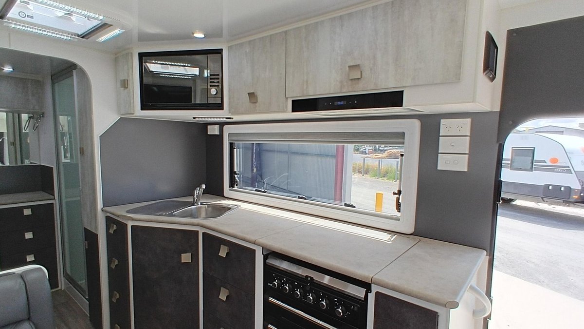 * Contains a 12V rangehood, 3 x gas and 1 x electric cooktop, a full gas oven, a microwave, and a top load washing machine.